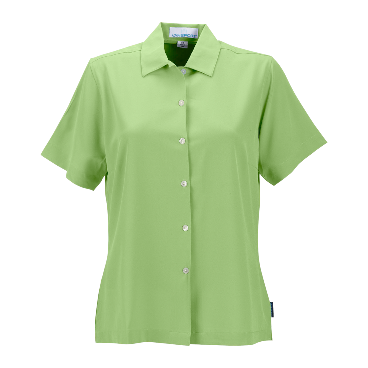 Want an ?easy-does it? atmosphere, but need a serious performing shirt? Our resort-style camp shirts are machine washable, breathable and wick moisture to keep you remarkably cool. 92% polyester/8% spandex, 4� oz. Vansport? moisture management poplin body, UV protection, convertible notched lapel collar, continuous-button front placket, polished etched buttons, bust darts, single-needle top-stitching, hemmed short sleeves, back yoke, curved-hem bottom with tailored side vents, replacement button. Imported. XS-3XL
