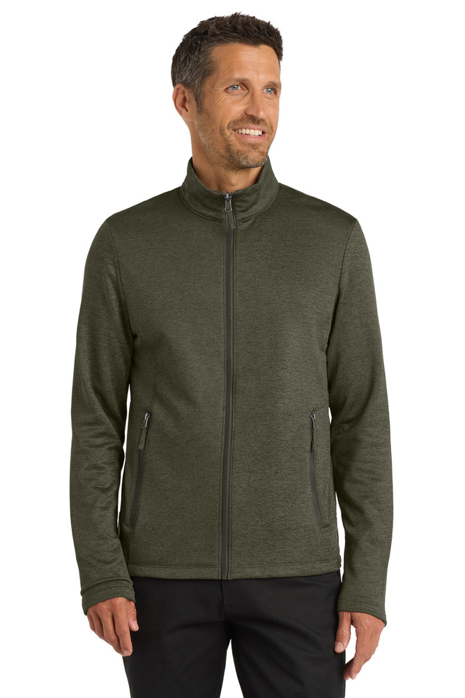 A smooth face, brushed back and striated pattern come together to make this warm fleece jacket undeniably on-trend. Can be zipped in and secured by snap attachments inside an outer Collective layer 6.3-ounce, 95/5 polyester/spandex fleece Slightly longer length Molded center front zipper Front reverse-coil zippered pockets Open cuffs and hem