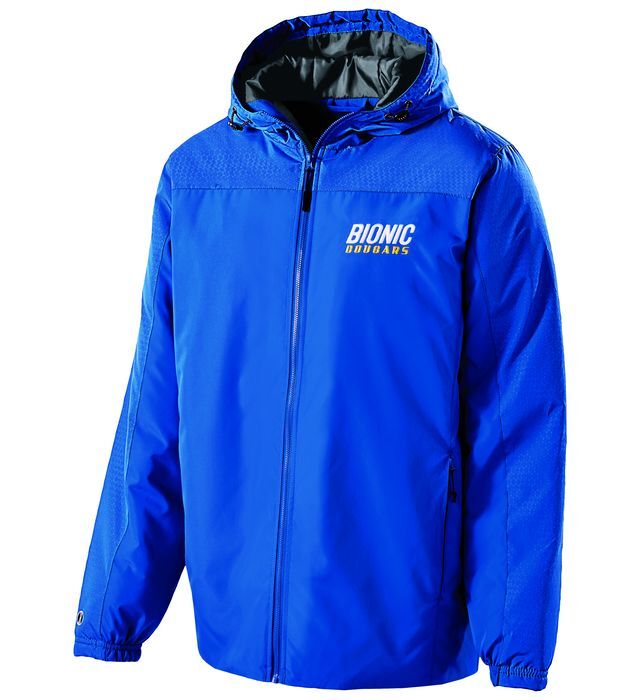 Micron(tm) polyester is a lightweight, wind/water resistant fabric * Embossed Micron blocking at hood, shoulders, and top sleeves with the Screenmesh pattern * Quilted, polyester, taffeta lining for added warmth * Woven label * Front zipper * Adjustable quilted hood with eyelets and concealed cord locks on Adult sizes only * Interior all access decoration zipper * Inside zippered pocket * Dual front zippered pockets * Half-elastic cuffs * Open bottom * Dropped tail * Water-resistant