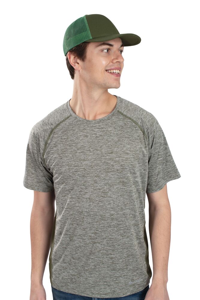 * 87% polyester/13% elastane heathered wicking knit with Coolcore(r) fabric technology * 92% polyester knitted mesh/8% elastane wicking knit inserts with Coolcore(r) fabric technology * Coolcore(r) fabric is engineered to distribute moisture quickly throughout the garment. As the moisture spreads it will dry faster and keep you cool and comfortable * Garment protects against the sun with (50+ UPF on body, 25+ on mesh inserts) * Wicks moisture * Tag-free label * Raglan sleeves