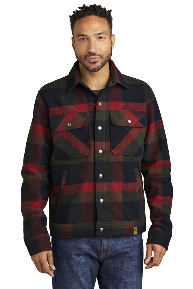 With its heavy wool-like feel, this jacket's the perfect outer layer. Reminiscent of aviator style jackets, it's ready to throw on over any Russell Outdoors ™ tee-making it ideal for a casual office vibe, corporate retreat or favorite hike. 12-ounce, 100% polyester Folded collar Full snap front with branded metal snaps 2 chest pockets with branded metal snaps Side pockets Banded fitted hem Exterior embossed faux leather tab at hem