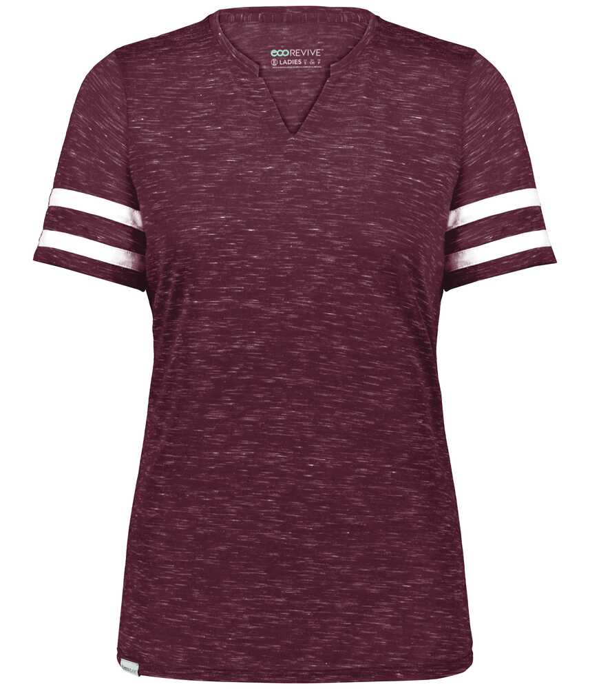 * Eco-Revive(r) product featuring 95% recycled polyester/5% cotton * Wicks moisture * Ladies' fit * Tag-free label * V-neck collar * Set-in sleeves