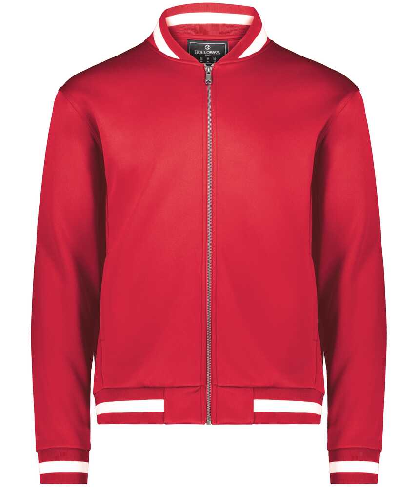 * 100% polyester double-knit * Woven label * Front zipper * Set-in sleeves * Front pockets * Dual inside pockets * Striped rib-knit collar, cuffs and bottom band