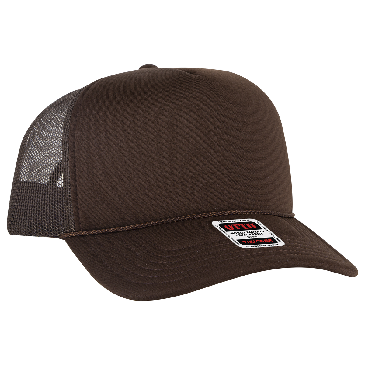 OTTO CAP® 5 Panel High Crown Mesh Back Trucker Hat OTTO CAP's World Famous Foam Front Trucker Hats High Crown - A taller profile, often seen in classic trucker and streetwear caps Premium Non-Toxic Foam - Thicker than our standard foam (Style 39-165) for a crinkle-free surface. Ideal for precise, vibrant embroidery and heat transfers 2mm thin rope across the front panel accents the hat Mesh back for enhanced airflow Premium durable plastic snap closure for a secure fit and easy adjustment Micro Mesh Standard Performance Sweatband - Moisture wicking technology for dry, all-day comfort