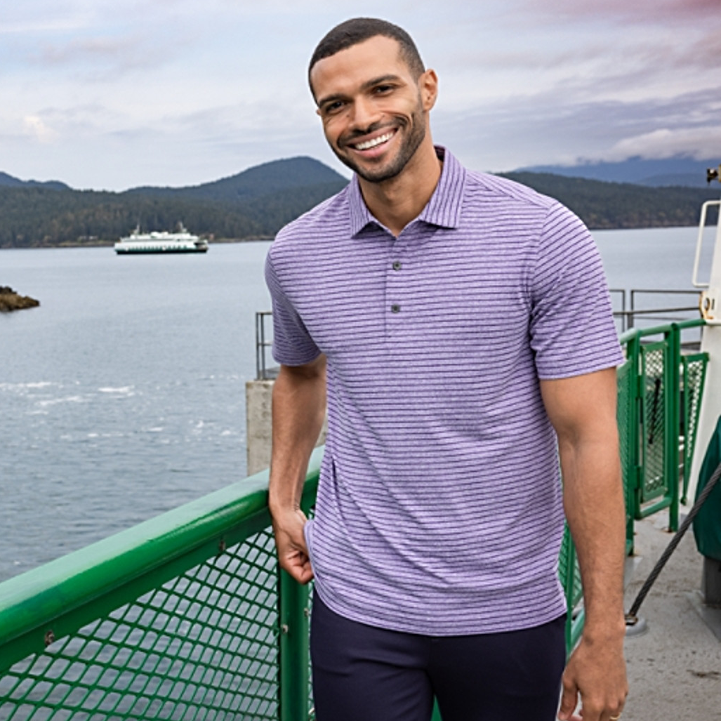 The iconic short sleeve Forge Eco Heather Stripe Recycled Polo is engineered with 4-way stretch for exceptional versatility, designed to be your favorite sustainable super soft men's short sleeve polo for golf, the clubhouse the office, travel, work from home, or wherever adventure takes you. Supremely soft and stretchy with a modern clean look, the moisture wicking, high quality Forge Eco Heather Stripe polo is a perfect blend of UPF sun protection certified eco-friendly polyester and spandex, resulting in the most versatile, sustainable and comfortable polo for you and the planet. - 60% Recycled Polyester, 36% Virgin Polyester, 4% Spandex Jersey - Tonal Heather Stripe Pattern - Material made from 10 recycled plastic bottles - UPF 50+ UV Sun Protection - Moisture Wicking - CB Logo trims - Recycled content certified by Global Recycled Standard - Machine Wash - Imported