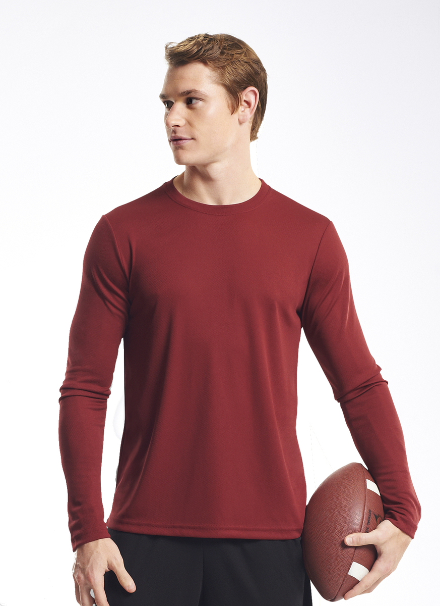Long sleeve with crew neck. Relaxed fit allows complete freedom of movement. 100% microfiber polyester oXymesh. Inherent moisture wicking to keep you dry and comfortable. Treated with BodyFreshe to inhibit the growth of odor causing bacteria Breathable, easy care XXS - 4XL