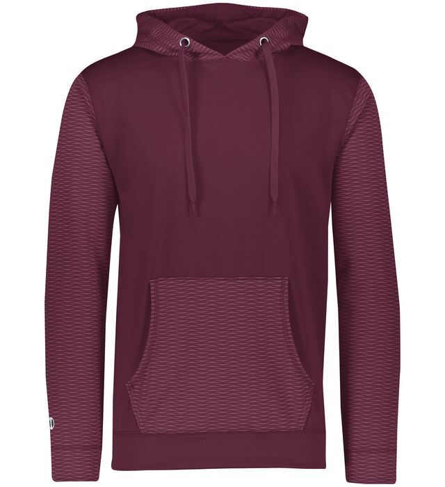 Dry-Excel(tm) 5.9 ounce 100% polyester performance wicking fleece features tonal tech weave print on hood, sleeves and pocket * Pattern is roller printed, making it decoration friendly * Wicks moisture * Tagless label * Pinhole mesh lined hood with thick drawcord and metal eyelets on Adult sizes only * Set-in sleeves * Front pouch pocket * Self-fabric cuffs and bottom band