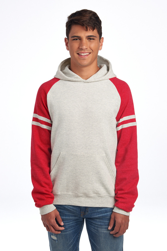8-ounce, 50/50 cotton/polyester NuBlend ® pill-resistant fleece Made with sustainably sourced USA-grown cotton High stitch density for a smooth printing surface Jersey-lined hood No drawcord in hood Contrast raglan sleeves Athletic-inspired varsity stripes on sleeves Front pouch pocket 1x1 rib knit cuffs and hem Double-needle coverstitching on armholes and hem Tear-away label