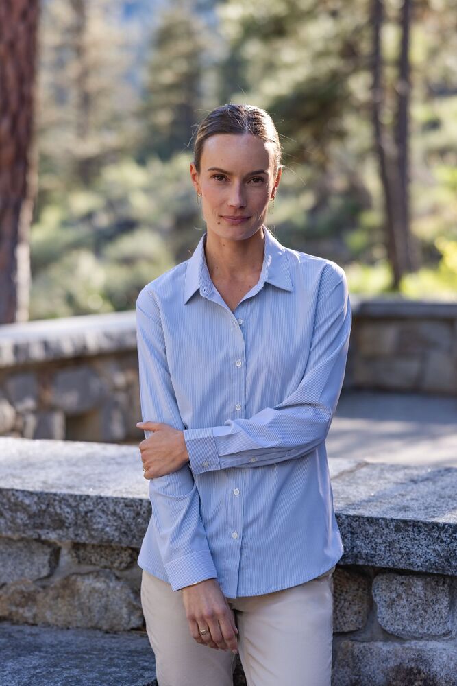 The iconic Cutter & Buck Skyline Recycled Pinstripe Womens Long Sleeve Spread Collar Dress Shirt is engineered with innovative work-to-weekend performance fabric for exceptional versatility.  Crafted to instill confidence, and engineered with high quality certified eco-friendly recycled polyester spandex weave for lightweight comfort and breathability, the Skyline will be your favorite womens patterned long sleeve dress shirt for work, travel, the big pitch, then happy hour. With the Skyline's PFAS free stain resistant finish and all-day recovery, you'll look and feel ready to create the next big thing.   - 95% Recycled Polyester, 5% Spandex - Made from GRS Certified post-consumer recycled polyester - Work-to-Weekend PFAS Free Stain Resistant Finish - Moisture Wicking Performance Fabric - Lightweight and Breathable - Easy Care - Button Down Collars and Barrel Cuffs - Epic Confidence Collection - Machine wash - Imported